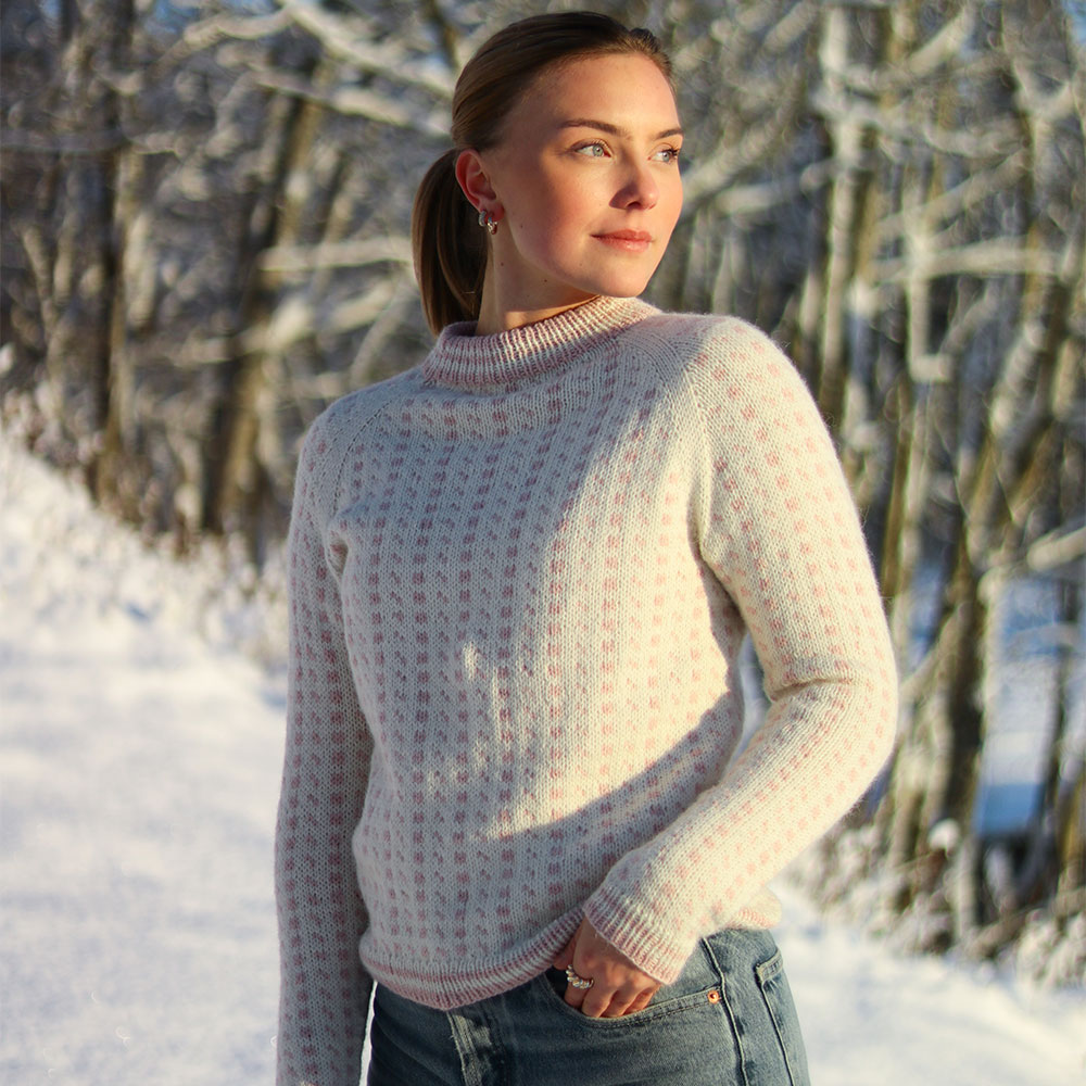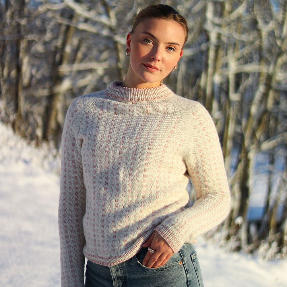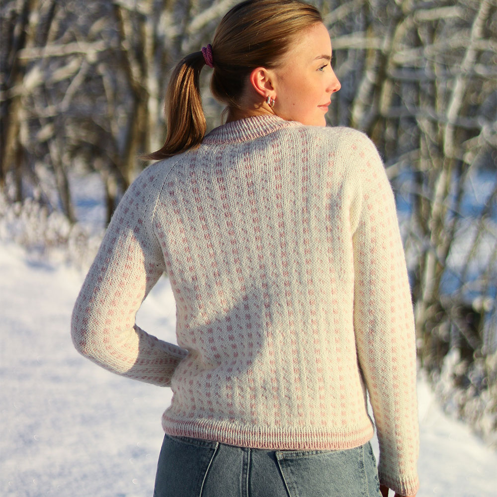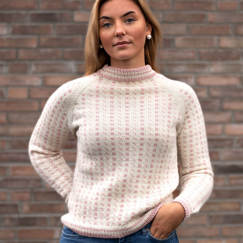 The sweater is knitted in the rnd from the top down. Raglan decreases are made before the body and sleeves are knitted separately.
