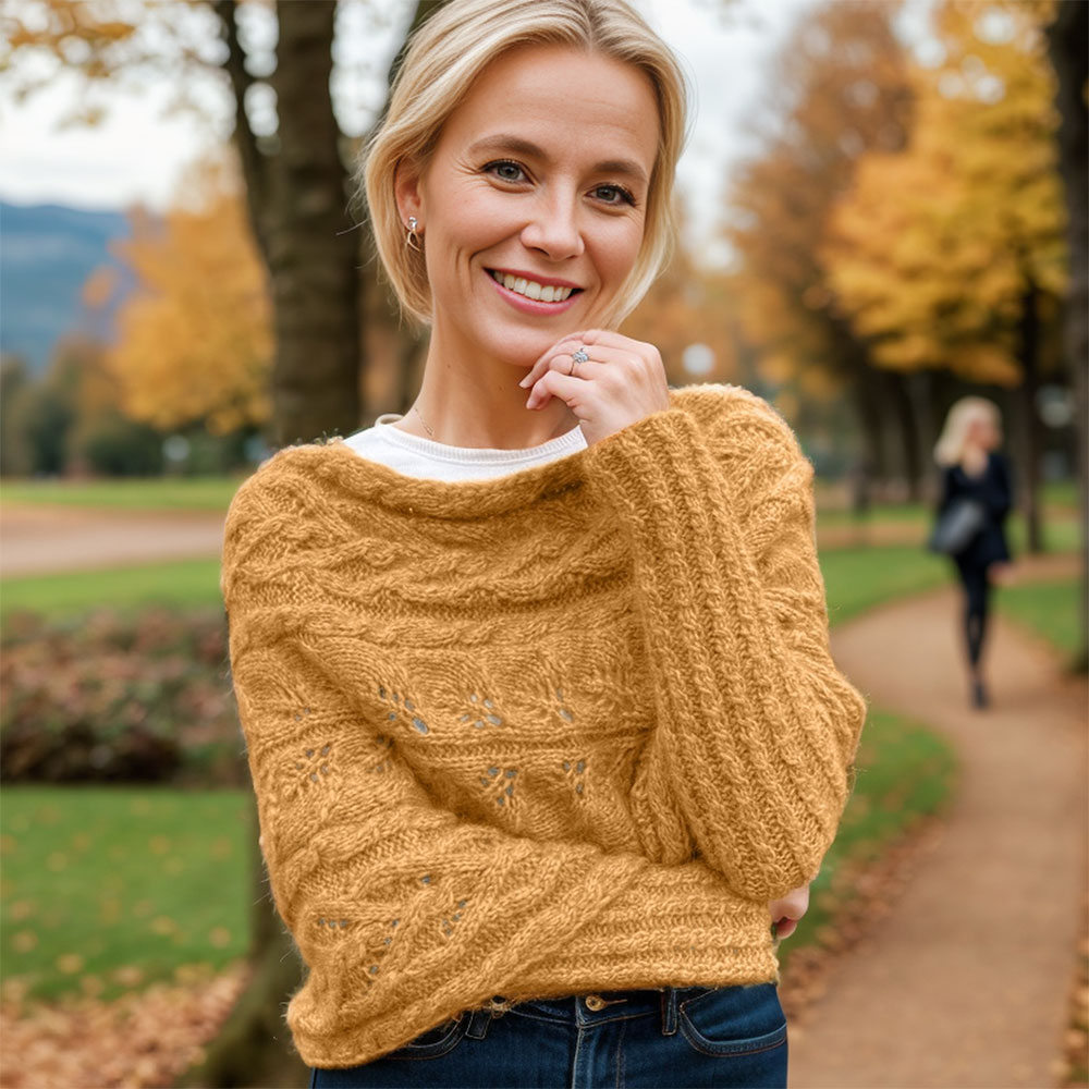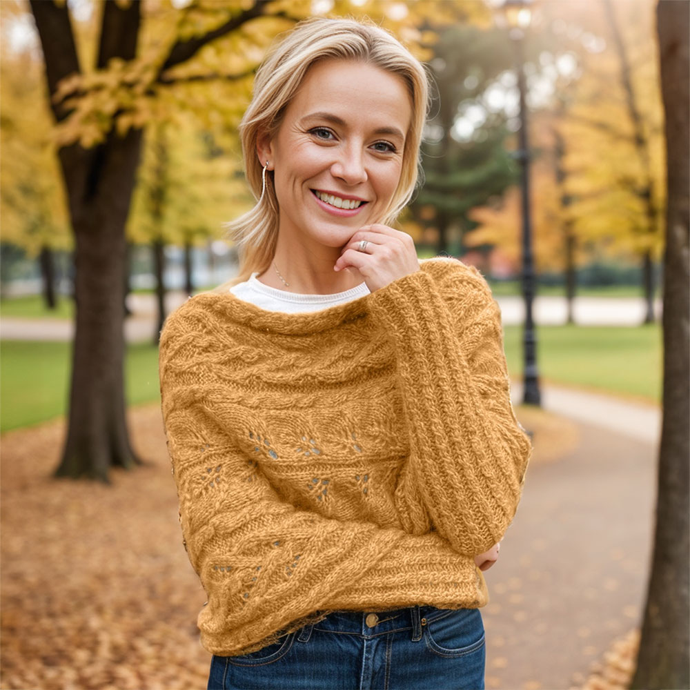 Designed to be worn all year round, this sweater scarf is lightweight yet warm, making it a versatile addition to any wardrobe. The unique leaf pattern adds a distinctive touch, while the warm mustard yellow shade brings a pop of color to your look.