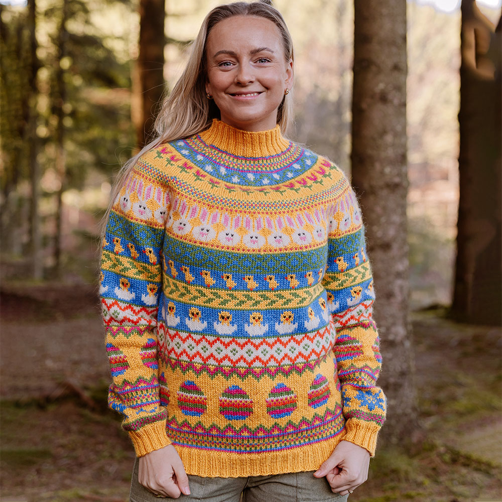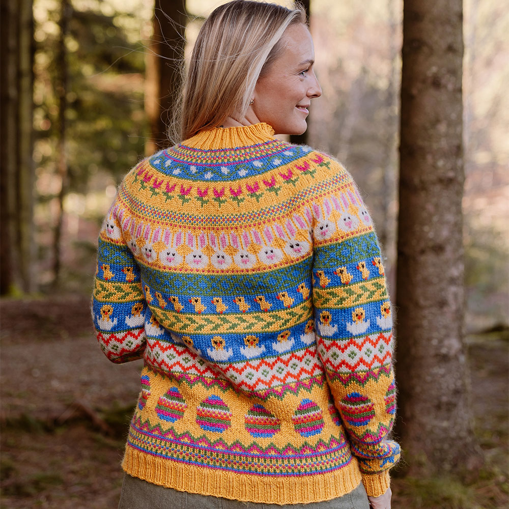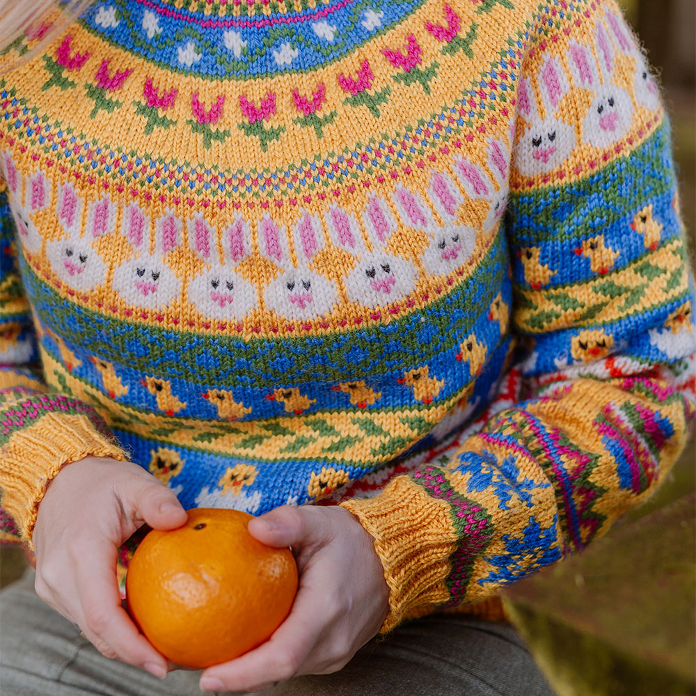 This delightfully ugly Easter sweater is knitted from the bottom up with a round yoke.