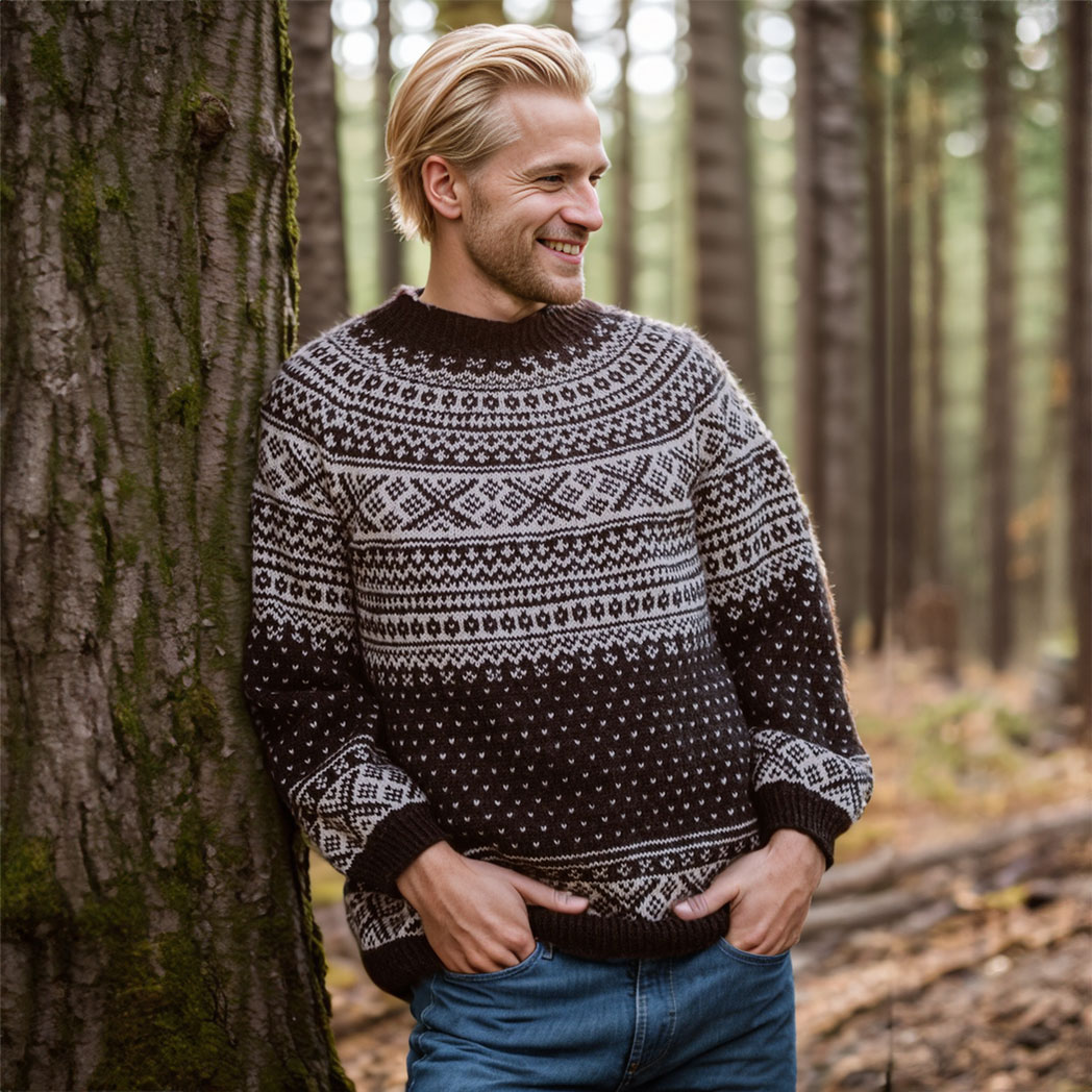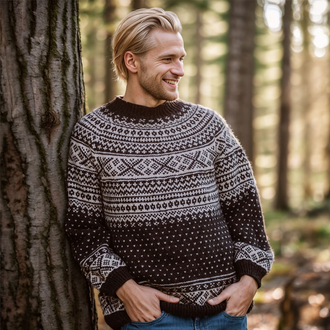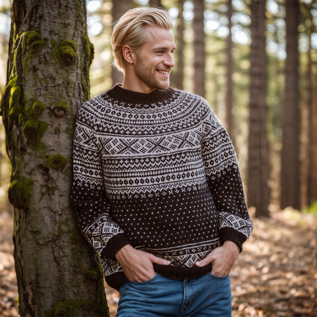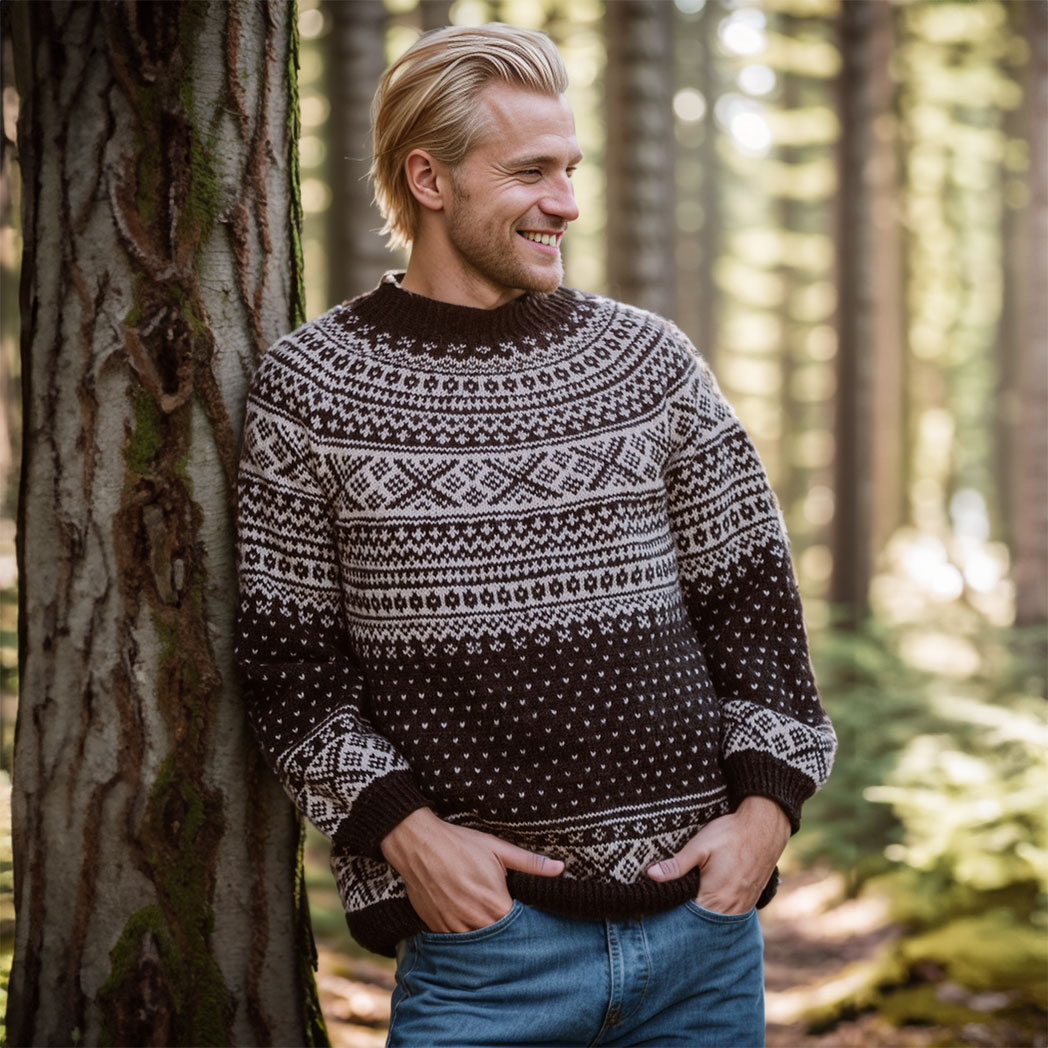 The Pål Sweater is a classic Setesdal´s sweater with a circular yoke for men, knit from the bottom up.